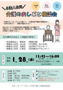 2026年1月13日 / Last updated : 2026年1月13日 未分類 1月28日(水)開催 「合同 介護のおしごと相談会」 令和8年1月28日(水)13:45~16:00 松任文化会館ピーノ 4階(白山市古城町2) にて「合同 介護のおしごと相談会」を開催します。 ご興味がある方は、是非お越しください。 多くのご来場をお待ちしております。